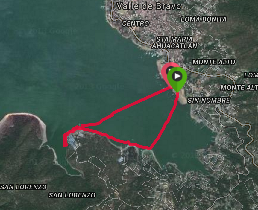 La ruta que hago es casi siempre la misma. Salgo del embarcadero de Sta. María hacia una casa naranja que se ve del otro lado del lago. Ahí nos vamos por la orilla hacia la punta que se ve a la derecha que es la entrada al Velo de Novia y ahí doy vuelta hacia la llegada del río (cascada del Velo). Según la distancia ahí me regreso, entro un poco o me sigo derecho. La ruta de hoy es la imagen de arriba. Donde me regresé es la entrada a la zona de velocidad controlada del Velo de Novia.