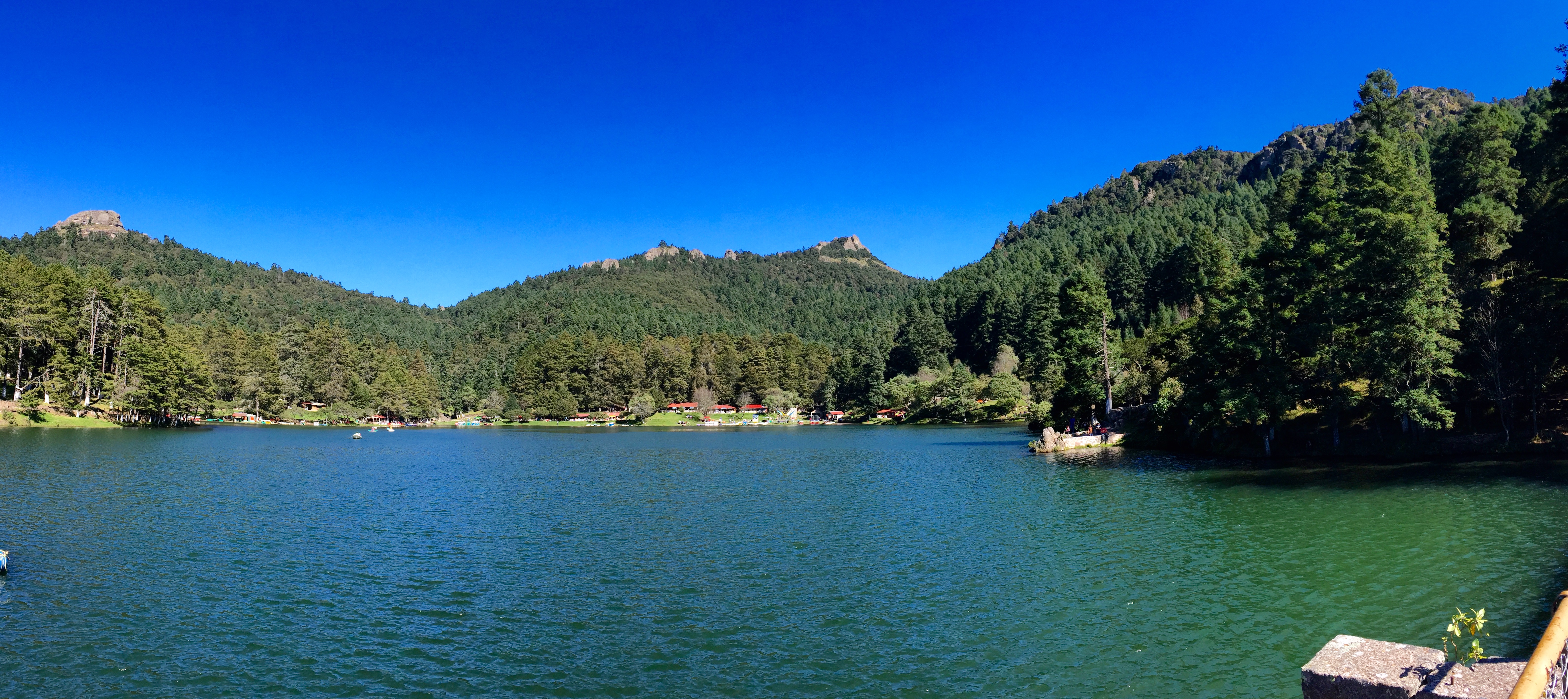 La Presa El Cedral está a unos 20 minutos de Pachuca, Hidalgo; unas dos horas en auto desde el D.F., sobre la carretera a El Chico. El lugar es simplemente hermoso. La presa debe medir unos 300 metros de largo por 200 de ancho. Es un valle enmarcado por un tupido bosque de pinos, oyamel y encinos. Hay una vereda por la que se puede caminar alrededor por donde hay varias cabañas con tiendas de dulces, quesadillas, café, renta de lanchas, baños y hasta venta de bolsas, sombreros y recuerditos. (Lástima que los comercios de este tipo no los hagamos de manera ordenada y regulada… y ¿por qué no?, bonita. Habrá quien diga lo contrario y nos diga que así es México -y efectivamente así es-. Yo no dejo de ser arquitecto y hay muchas cosas que me gustaría fueran diferentes, pero… si no propongo y no hago -algo en este respecto, por lo menos-, mejor no critico.) Hay gente en los alrededores haciendo picnic, tomando el sol, paseando, pedaleando en lanchas rentadas y hasta pescando. Recomiendo el lugar para ir a pasar algunas horas, es muy agradable. Por lo menos hoy no había tanta gente que lo hiciera incómodo, hay mucho espacio y puede uno mantenerse apartado.