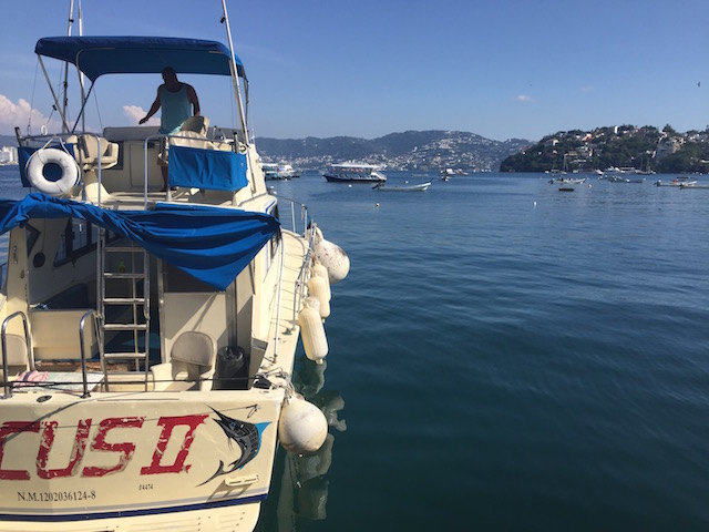 Raymundo es todo un personaje, de fácil palabra y muy viváz; demuestra mucho respeto y cariño al mar. Nada en él prácticamente todos los días con su grupo Club Dorados de Acapulco. Nos platica Lu, mientras Raymundo consigue el yate, que son como 20 o mas y que diario hacen algún nado 6 o hasta 10 personas. Nos explica: ‘Hay 3 distancias: la corta: de la playa a las boyas amarillas y de regreso; la intermedia: a las boyas amarillas, después a las blancas y de regreso y la larga: a la Piedra del Elefante ida y vuelta.’
